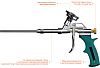 - Применяется для нанесения полиуретановой пены, упакованной в баллоны.