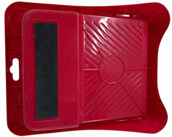 - Оснащена рифлёной площадкой для прокатывания валика или кисти и равномерного распределения краски по инструменту.
